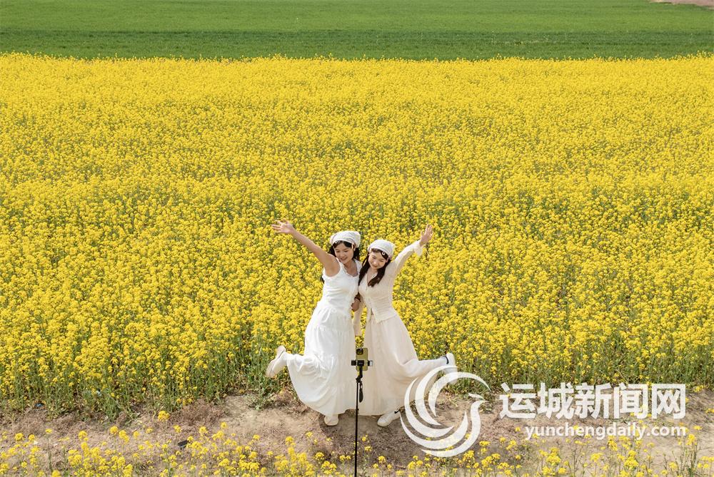 一邊是巍巍中條,一邊是七彩鹽湖,湖邊的油菜花田仿佛是鑲嵌其間的一塊塊黃色寶石,綠油油的春日麥田仿若翡翠,燦燦的黃、茵茵的綠,勾勒出春日里最美妙的畫卷。游客或是踩著自行車享受輕松愜意,或是徜徉花海拍照留念……游走其中,能聞到油菜花的清香、泥土的清新。