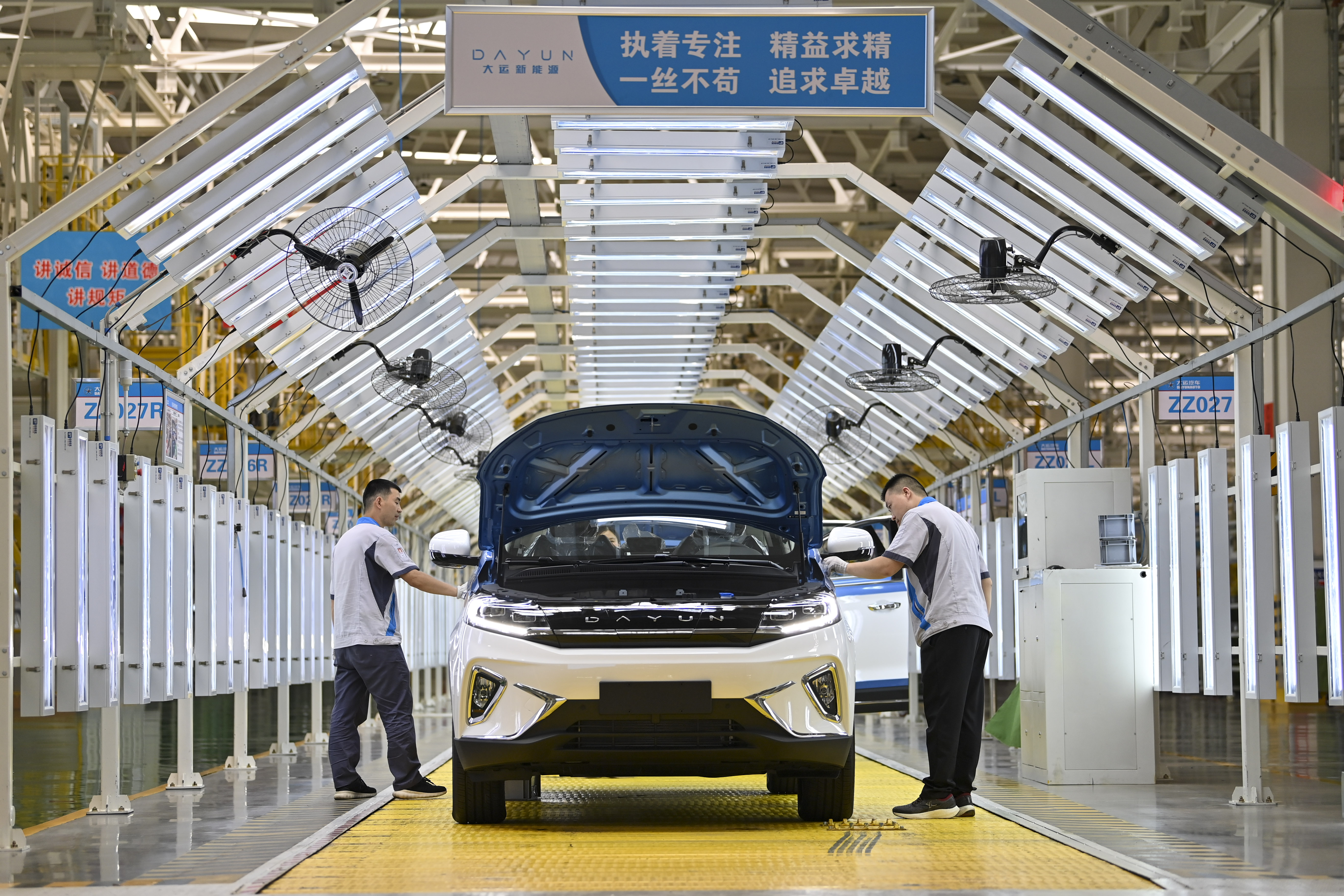 6月13日,在大運(yùn)新能源汽車(chē)生產(chǎn)基地,工人對(duì)新能源汽車(chē)進(jìn)行下線(xiàn)前的檢測(cè)。