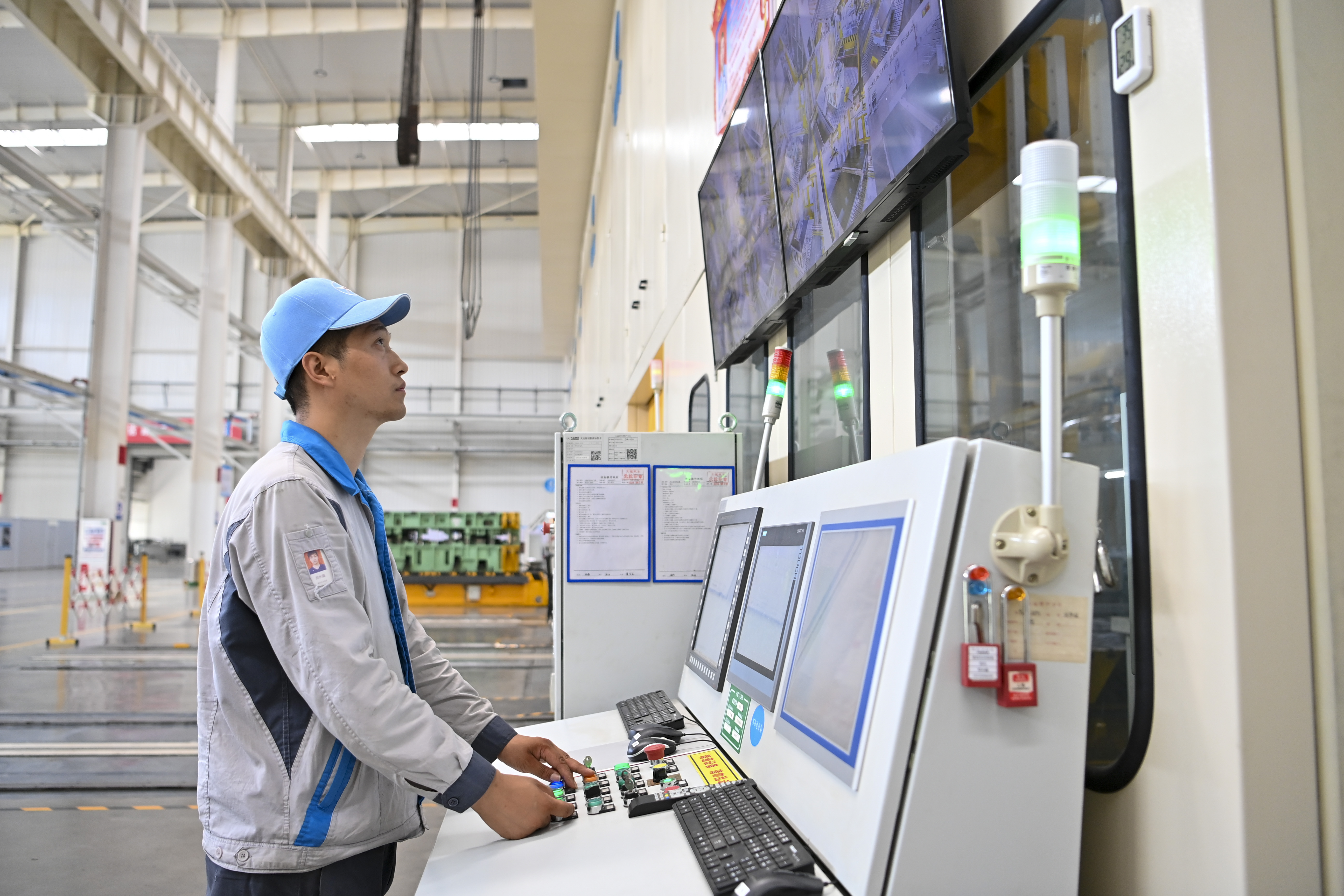 6月13日,在大運(yùn)新能源汽車(chē)生產(chǎn)基地,工人通過(guò)總控臺(tái)查看設(shè)備運(yùn)轉(zhuǎn)情況。