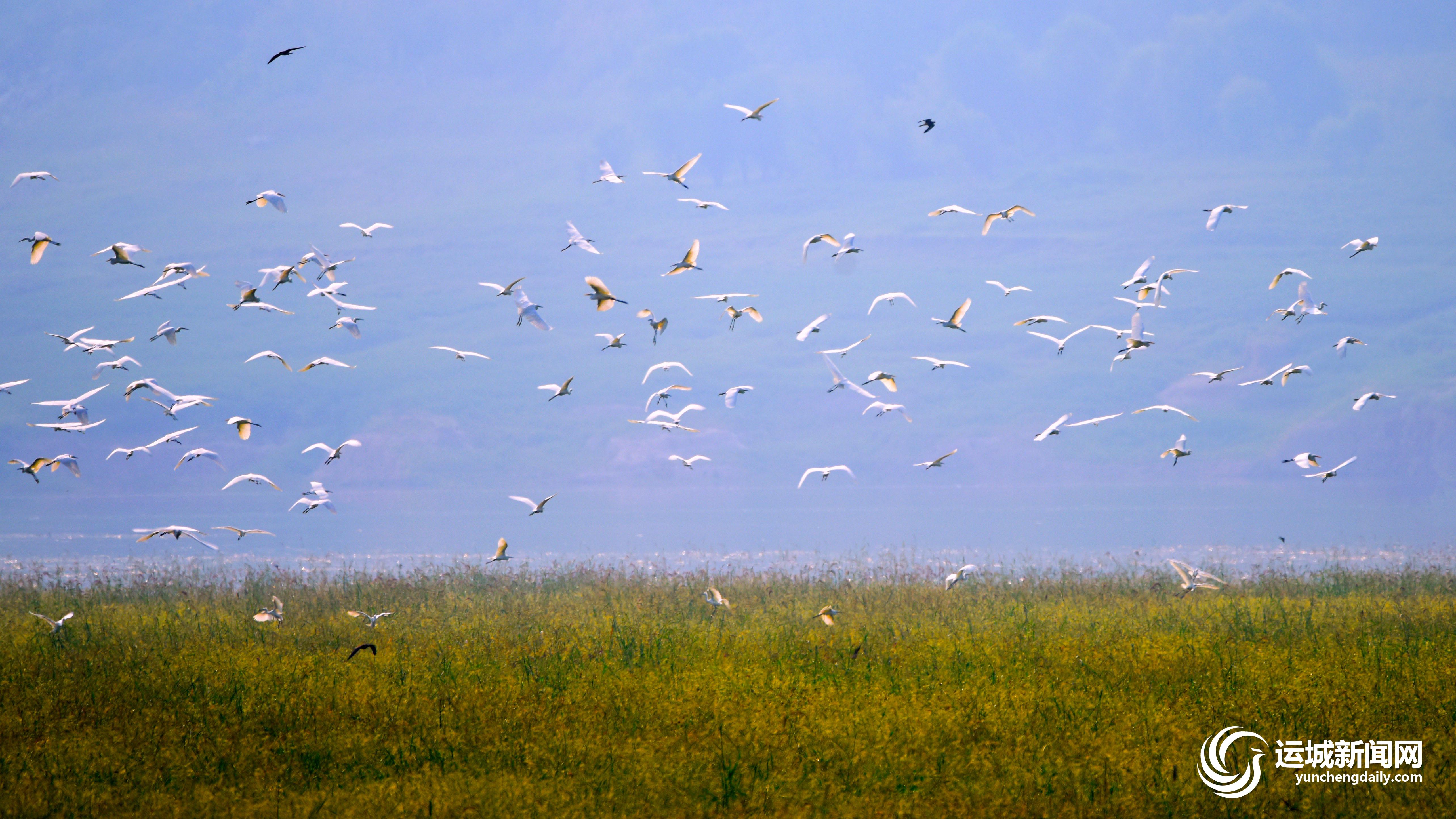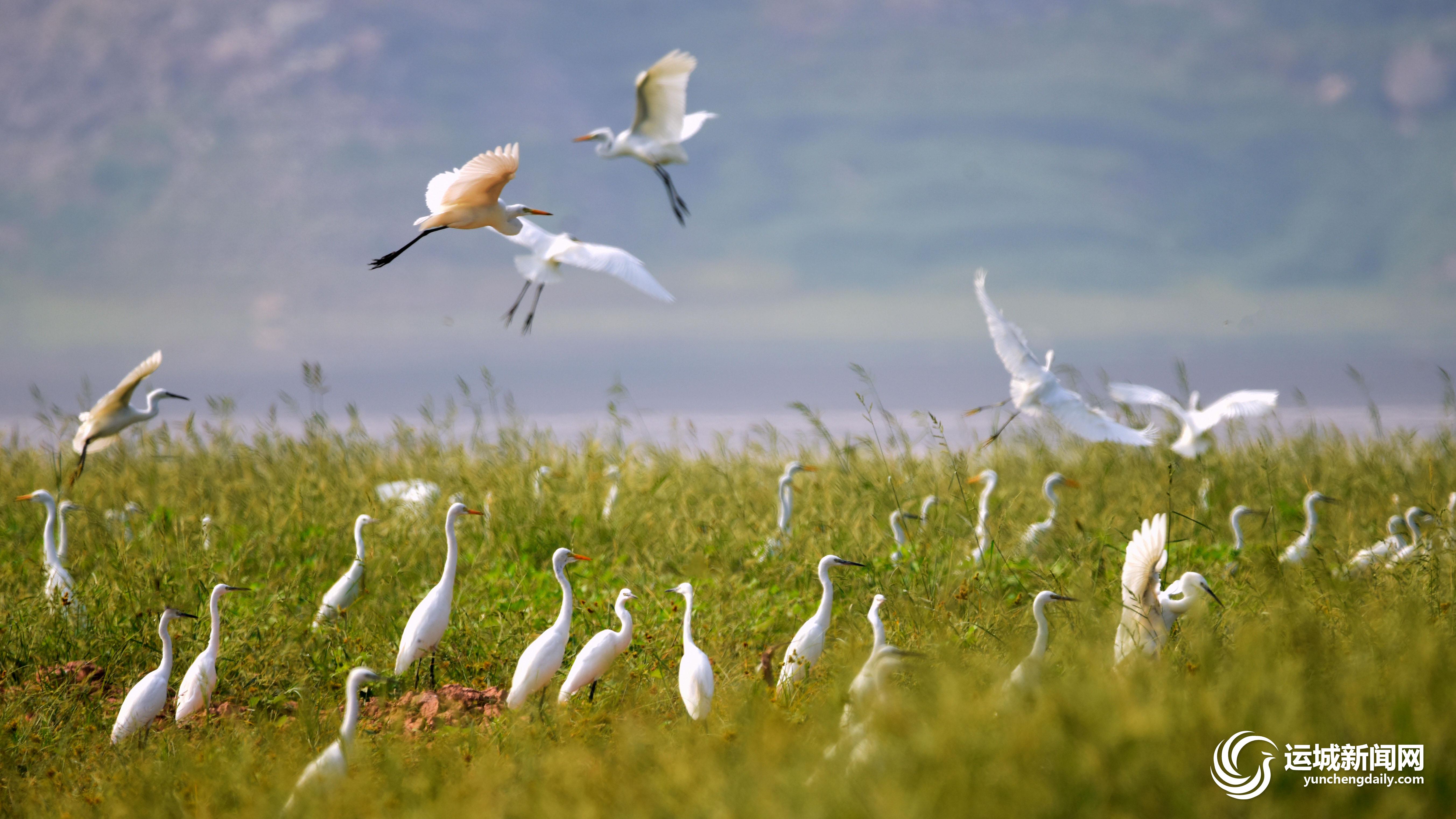 9月4日,成群的白鷺在垣曲縣古城國家濕地公園棲息覓食。