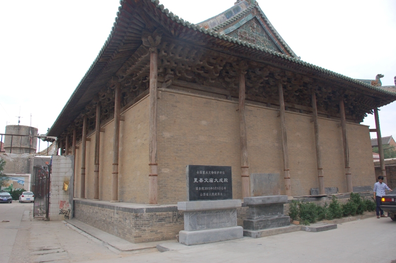 位于城內(nèi)解放南路。坐北朝南,文廟做為歷代祭祀孔子的儒教場所,創(chuàng)建于宋,元、明時期累加修葺,明嘉靖三十四年河?xùn)|持續(xù)百日大地震,大成殿獨(dú)存城中,歷屆縣令相繼修繕保存完整,依中軸線依次建有萬代宗師坊、欞星門、大成殿、明倫堂及東西廂房,后因年久失修毀壞,僅大成殿獨(dú)存。大成殿東西長35米,南北寬24米,總面積840平方米。面闊七間,進(jìn)深五間,單檐歇山頂。多為明代構(gòu)件,局部仍保留了宋、元時期建筑風(fēng)格,柱頭卷剎之制、駝峰的運(yùn)用、椽頭斜搭掌工藝代表了早期建筑做法與承襲。在結(jié)構(gòu)力學(xué)上達(dá)到了很高技術(shù)水平,屋頂及兩山花琉璃藝術(shù)更是精美絕倫。1985年,公布為縣保單位,2004年,公布為市保單位,2013年5月,國務(wù)院公布為全國重點(diǎn)文物保護(hù)單位。2014年,國家文物局下?lián)軐m?xiàng)資金,完成了大成殿整體抬升修繕保護(hù)工程。