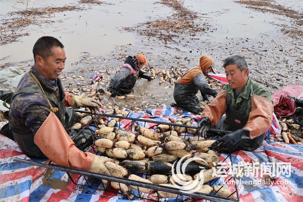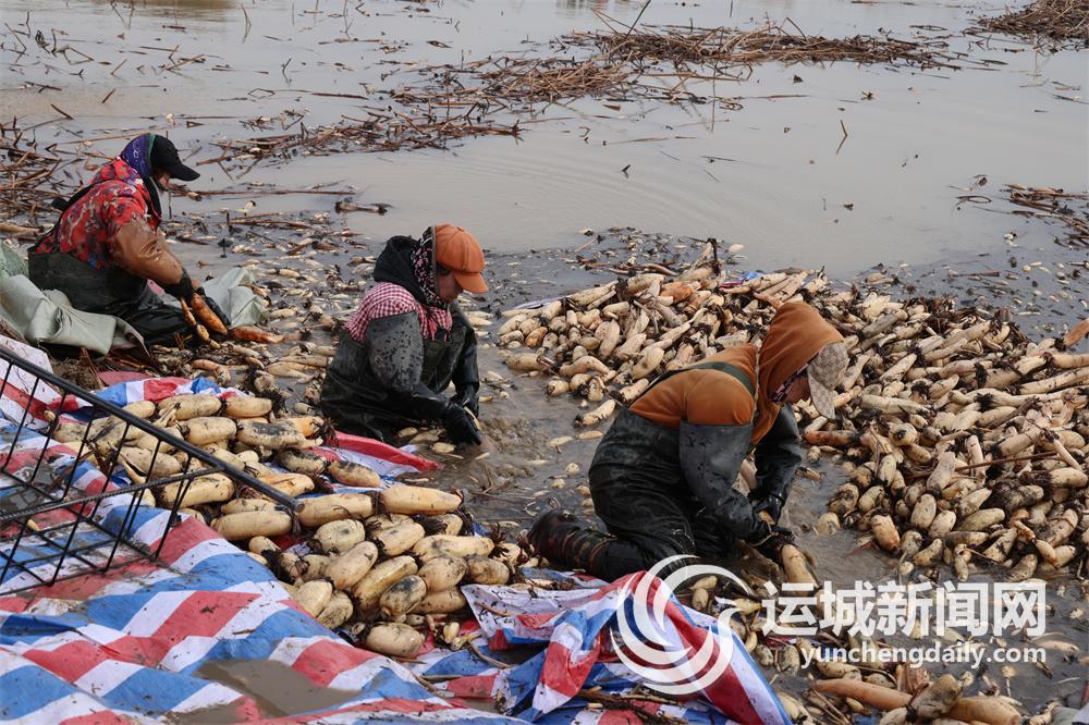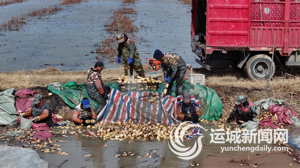 2月12日,永濟市蒲州鎮(zhèn)黃河灘涂的藕池里,藕農(nóng)在采挖蓮藕。近期,當?shù)厝f畝藕田迎來豐收季。