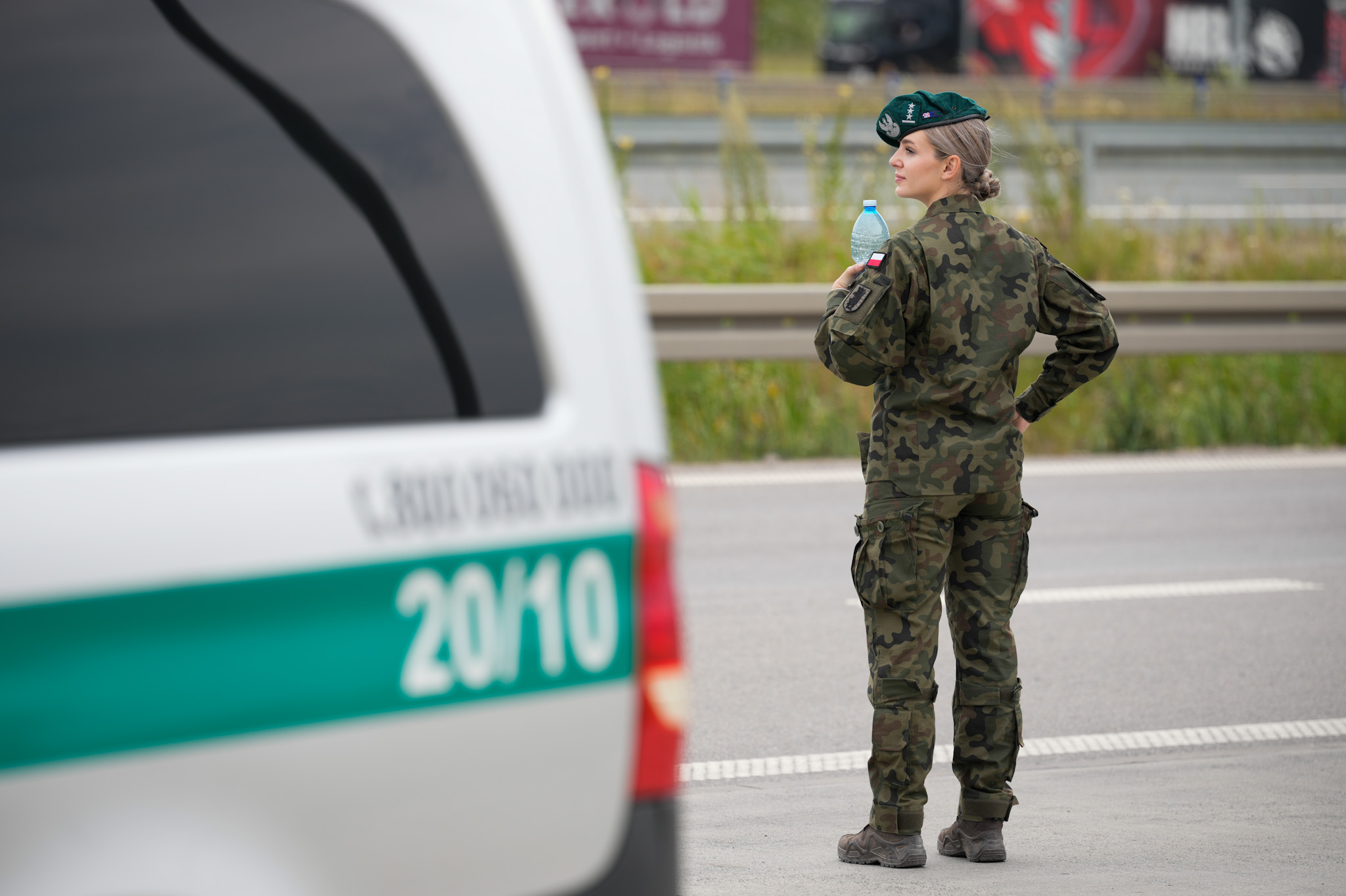 7月7日,在波蘭與立陶宛交界的蘇瓦烏基縣布濟(jì)斯科村,一名波蘭邊防女警在路邊執(zhí)勤。
