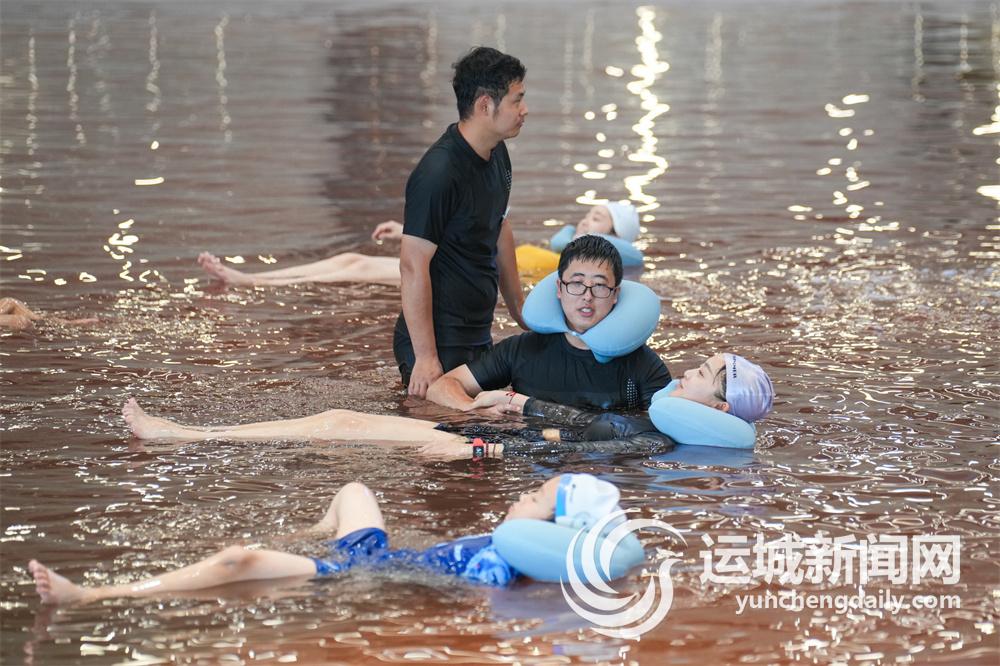 游客在運(yùn)城鹽湖景區(qū)體驗(yàn)鹽水漂浮