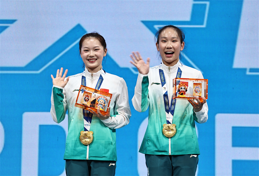 8月10日,冠軍中國(guó)組合胡譯乘(左)/張欣欣在頒獎(jiǎng)儀式上,二人都來(lái)自山西隊(duì)。