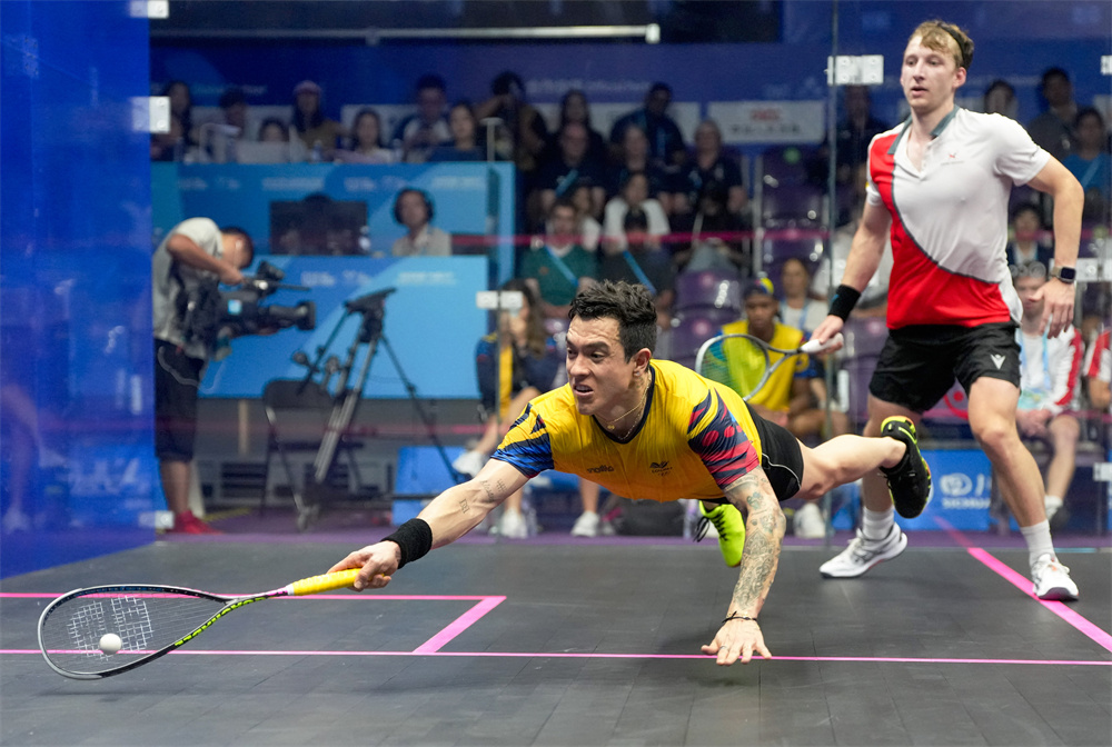 8月12日,羅德里格斯(左)在比賽中回球。當(dāng)日,在2025年成都世運(yùn)會(huì)壁球男子單打銅牌賽中,哥倫比亞選手羅德里格斯戰(zhàn)勝瑞士選手施泰因曼,獲得銅牌。新華社記者