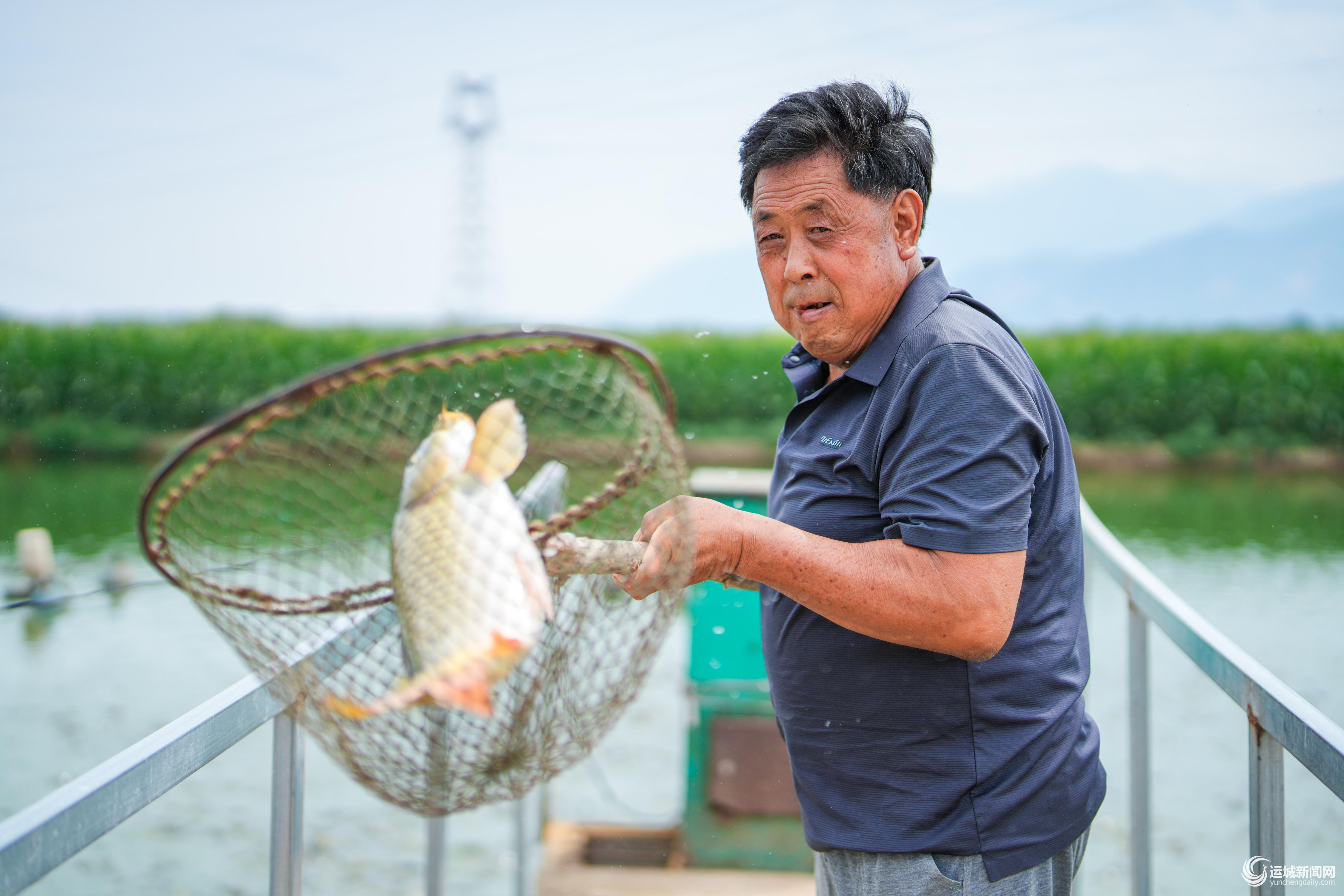 譚文學(xué)是永濟(jì)市興茂養(yǎng)魚專業(yè)合作社的一名成員,有5口塘,總共30畝左右,每年產(chǎn)魚兩萬五千多公斤,其中黃河大鯉魚占7成。平時(shí),除了給魚喂食外,還有一項(xiàng)重要的工作就是調(diào)水,也就是根據(jù)水的情況,給水里撒菌制劑和生物制劑,讓藻類產(chǎn)生光合作用,吸收有害物質(zhì),產(chǎn)生氧氣,讓菌類分解魚類的糞便,從而實(shí)現(xiàn)生態(tài)養(yǎng)殖。
