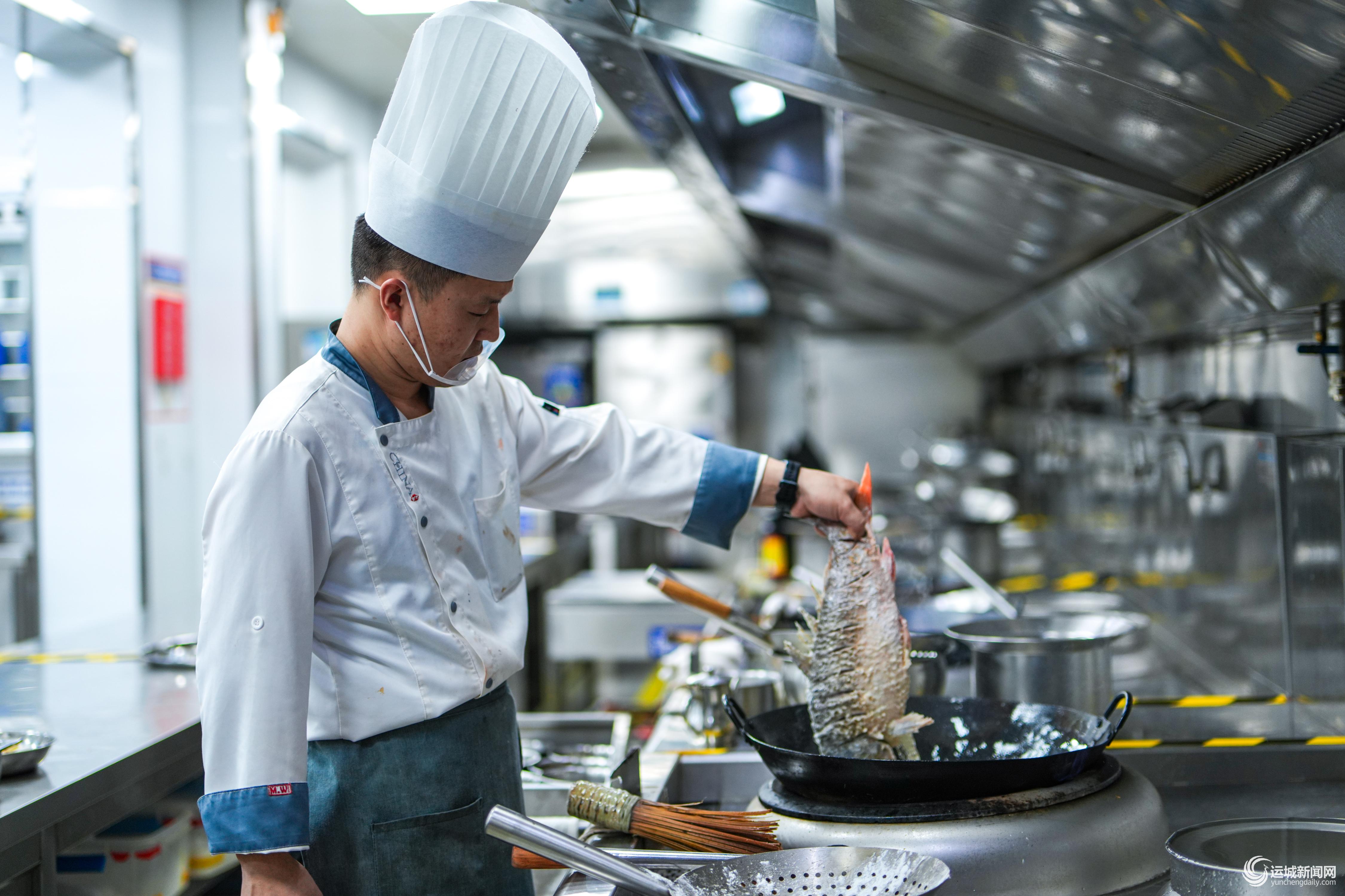 運(yùn)城賓館后廚內(nèi),廚師將裹滿淀粉的黃河大鯉魚下鍋油炸。