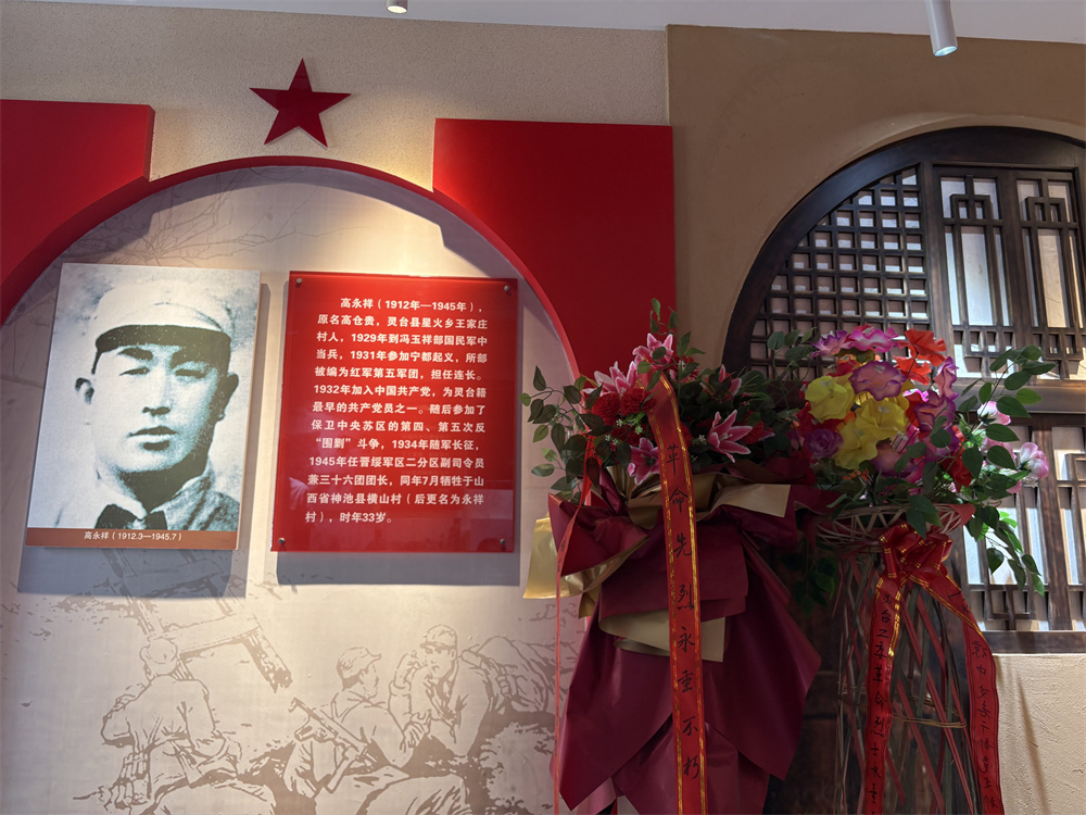 在中共靈臺工委紀念館的高永祥專題展廳內(nèi),群眾自發(fā)獻上的花籃擺放在高永祥照片旁。紀念館工作人員介紹,前來吊唁的群眾很多,在清明節(jié)更是鮮花滿廳。