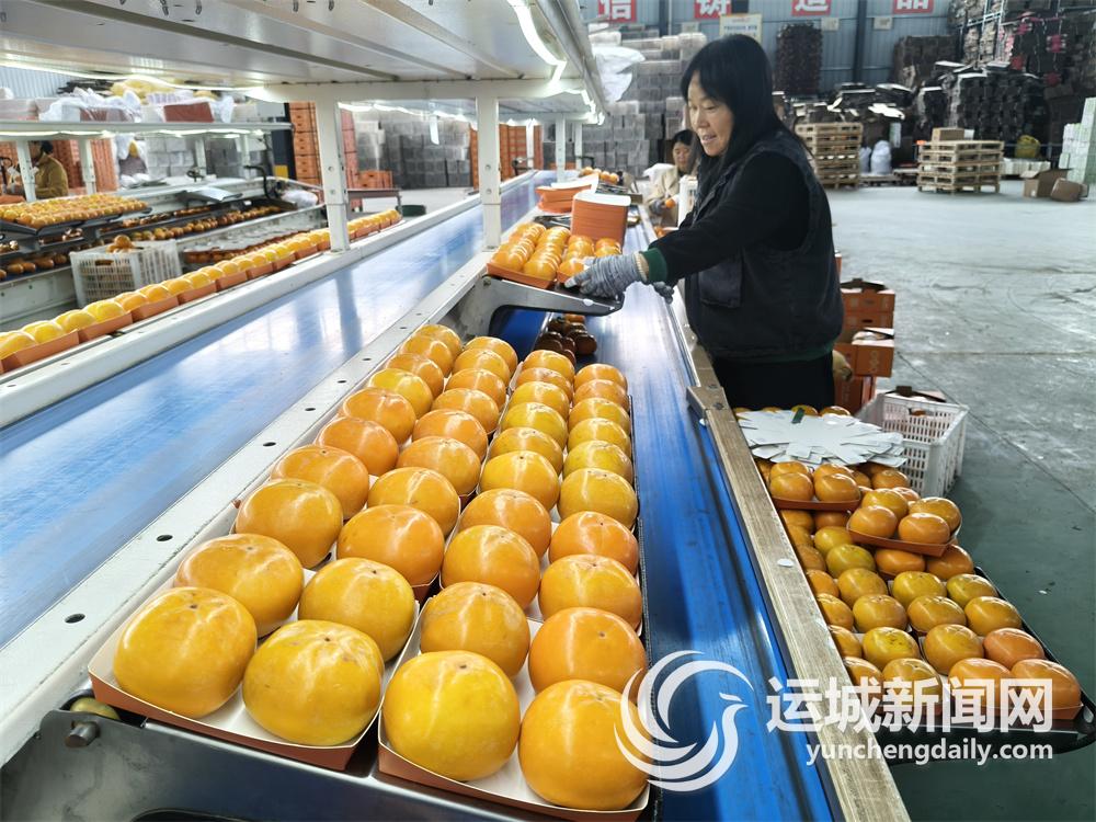 臨猗縣衛(wèi)峰果品種植專業(yè)合作社分選設(shè)備旁,工作人員在包裝甜柿。