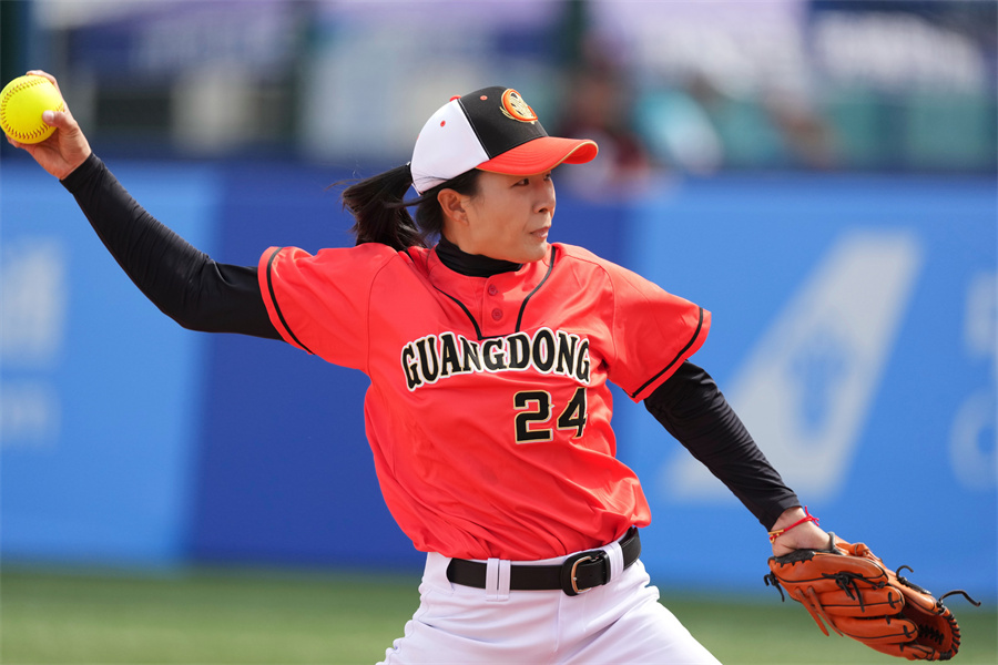 11月10日,廣東隊球員劉彩紅在比賽中投球。