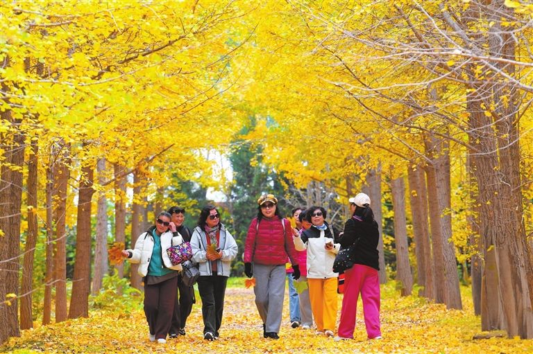 初冬時節(jié),翼城縣唐興鎮(zhèn)古城社區(qū)的銀杏苑內(nèi),上千株銀杏樹披上金色紗衣,絢麗迷人。暖黃色的銀杏葉鋪滿地面,形成一條“金色”走廊,遠遠看去,像一幅濃墨重彩的油畫,吸引眾多游客賞景、拍照、打卡。