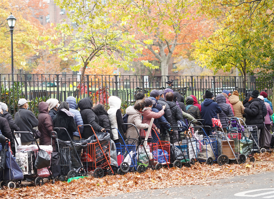 11月12日,人們?cè)诿绹?guó)紐約一處食物發(fā)放點(diǎn)領(lǐng)取食物。