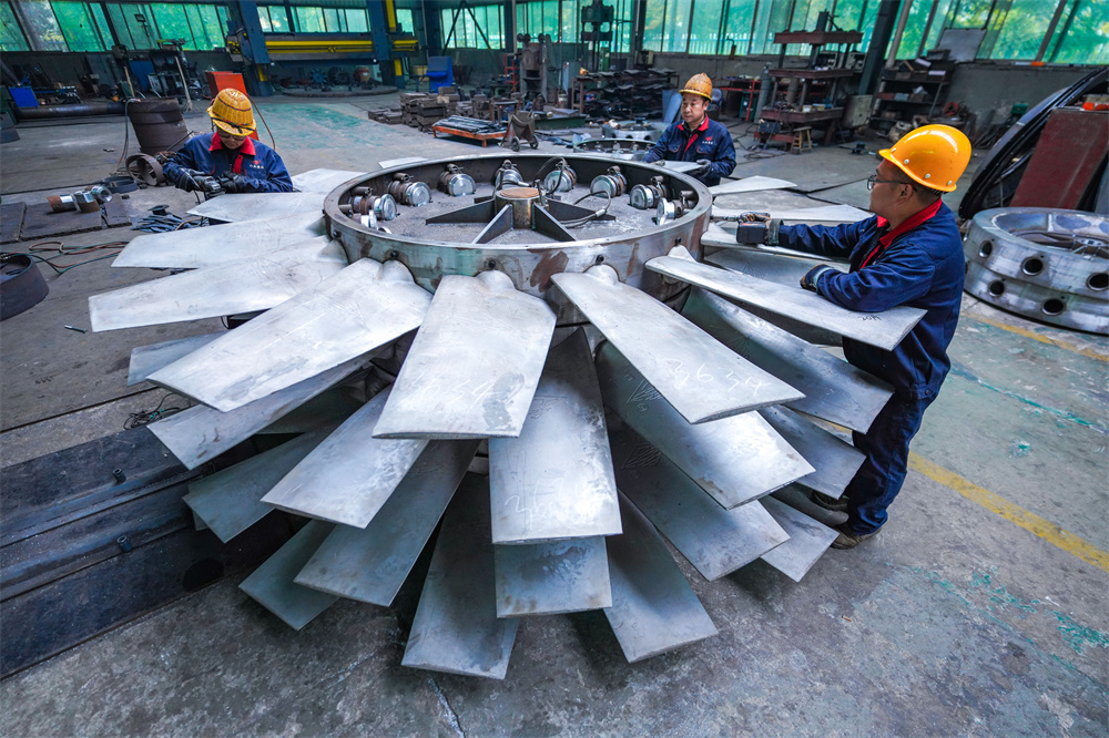山西安運風機有限公司車間內(nèi),工人在組裝風機扇葉。