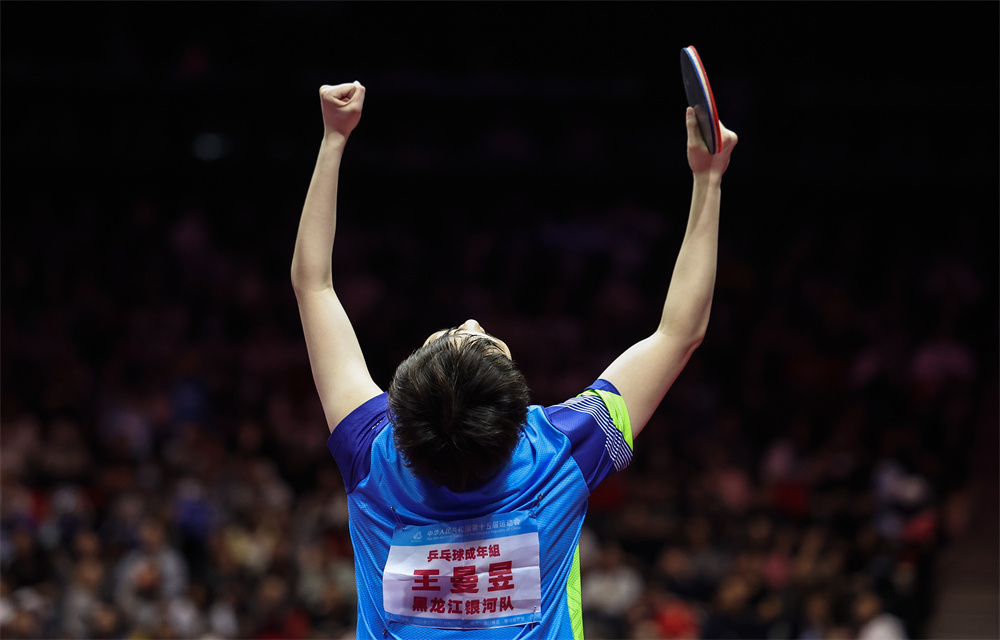 11月16日,黑龍江隊(duì)選手王曼昱慶祝獲勝。當(dāng)日,在澳門(mén)舉行的第十五屆全國(guó)運(yùn)動(dòng)會(huì)乒乓球女子單打金牌賽中,黑龍江隊(duì)選手王曼昱4比2戰(zhàn)勝河北隊(duì)選手孫穎莎,獲得金牌。 新華社記者 陳斌 攝