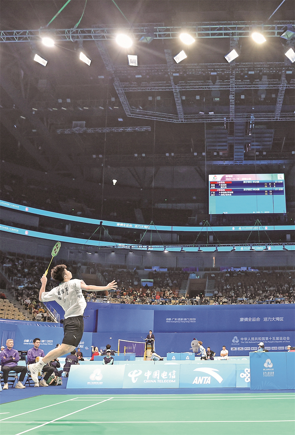 11月18日,福建隊(duì)選手翁泓陽在比賽中回球。當(dāng)日,在深圳舉行的第十五屆全國運(yùn)動(dòng)會(huì)羽毛球男子單打半決賽中,福建隊(duì)選手翁泓陽2比0戰(zhàn)勝安徽隊(duì)選手董天堯,晉級(jí)決賽。