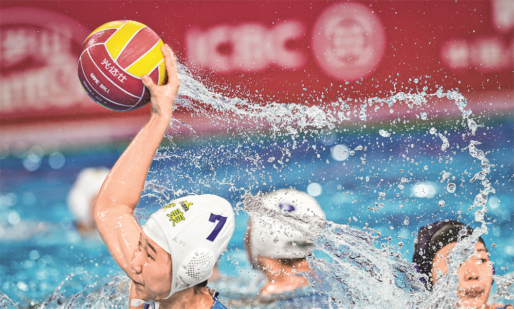11月18日,廣東隊球員歐鎧淇在比賽中射門。 當日,在廣州舉行的第十五屆全國運動會女子水球小組賽中,廣西隊25比4戰(zhàn)勝廣東隊。新華社記者 潘昱龍 攝