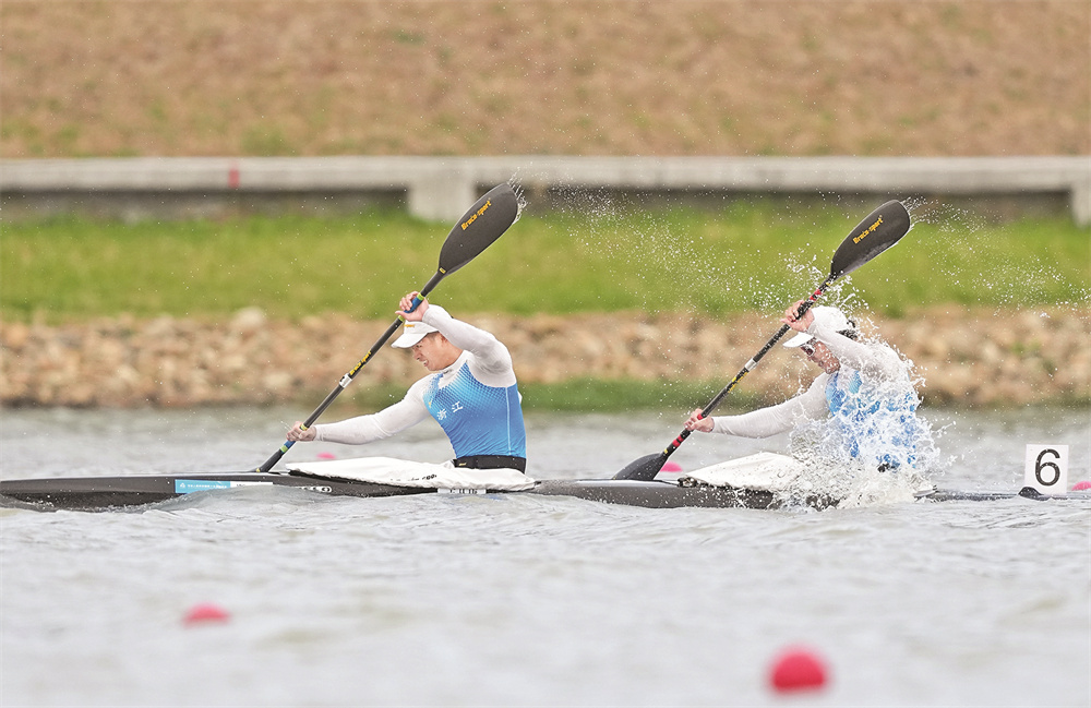 11月19日,浙江隊(duì)組合王叢康(左)/徐佳煒在比賽中。最終,他們獲得冠軍。當(dāng)日,第十五屆全國運(yùn)動會皮劃艇靜水項(xiàng)目男子500米雙人皮艇決賽在廣州舉行。