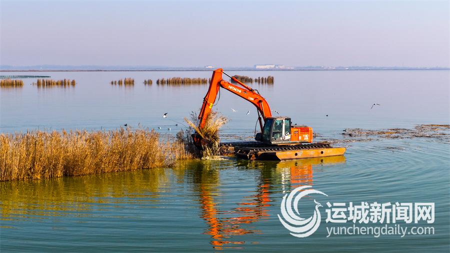 11月21日,永濟(jì)市伍姓湖濕地內(nèi),一臺(tái)大型挖掘機(jī)緊張有序地開展湖底淤泥與雜草清理作業(yè)。一群遠(yuǎn)道而來的海鷗環(huán)繞機(jī)械盤旋飛舞,轟鳴的機(jī)械聲與清脆的鳥鳴聲此起彼伏,交織成一曲美妙和諧的冬日樂章。