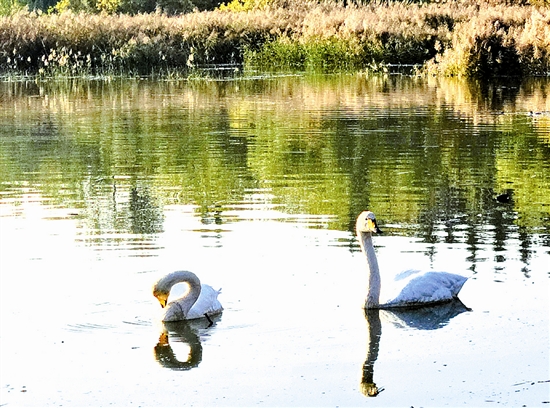 近日,在三門峽天鵝湖國家城市濕地公園,陽光為湖面鍍上柔光,天鵝水中的倒影悄然拼成靈動字符,令人驚嘆不已。記者 李秀芝 攝