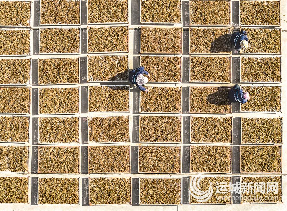11月29日,在萬榮縣集裕家庭農(nóng)場,工人們忙著晾曬中藥材黃精。