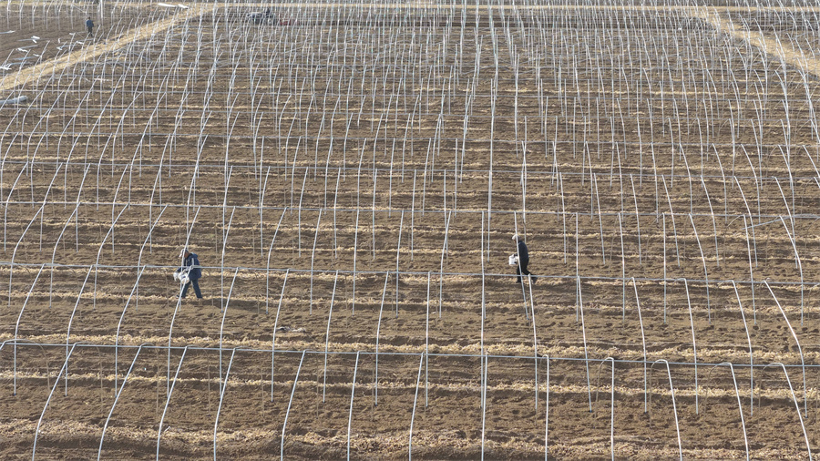 12月7日,永濟市栲栳鎮(zhèn)過遠(yuǎn)村西瓜種植基地,工人們在搭建溫室大棚,同步推進施肥與旋耕作業(yè)。