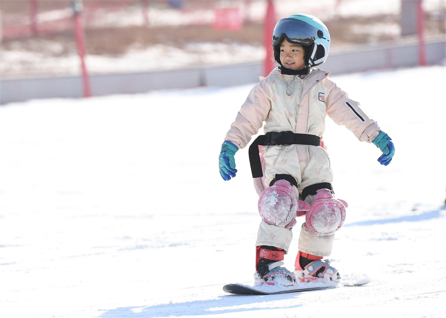 12月9日,一名小朋友在北京漁陽國際滑雪場滑雪。