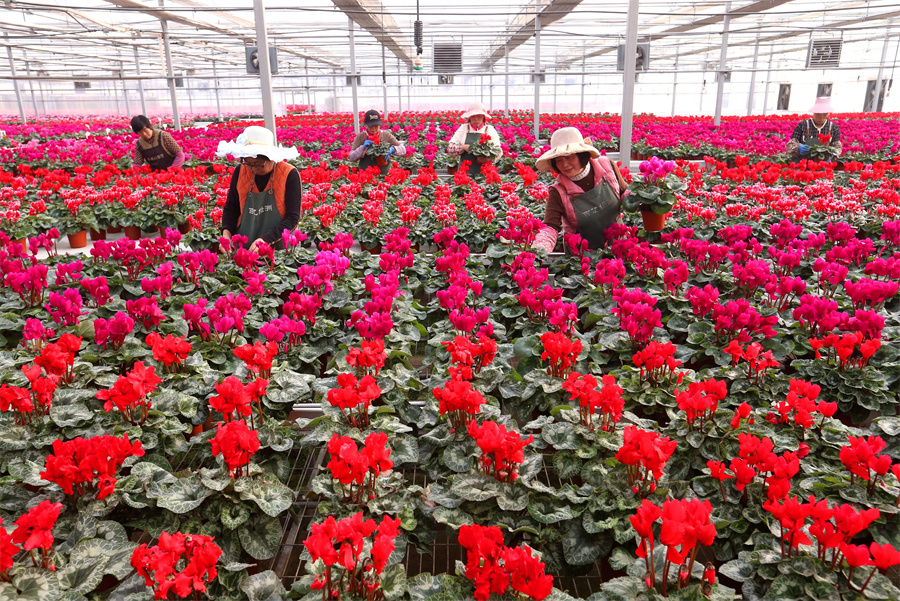 12月10日,花農(nóng)在山東省青島市即墨區(qū)靈山街道百億綠洲花卉種植基地管護(hù)花卉。