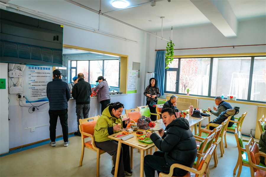 在疊翠社區(qū)食堂,志愿者招呼居民就餐。