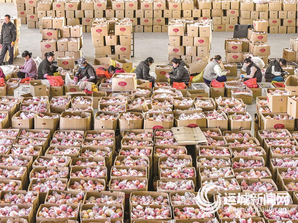 萬榮縣恒源果業(yè)有限公司的員工對蘋果進(jìn)行分級。 記者 茹雅 攝