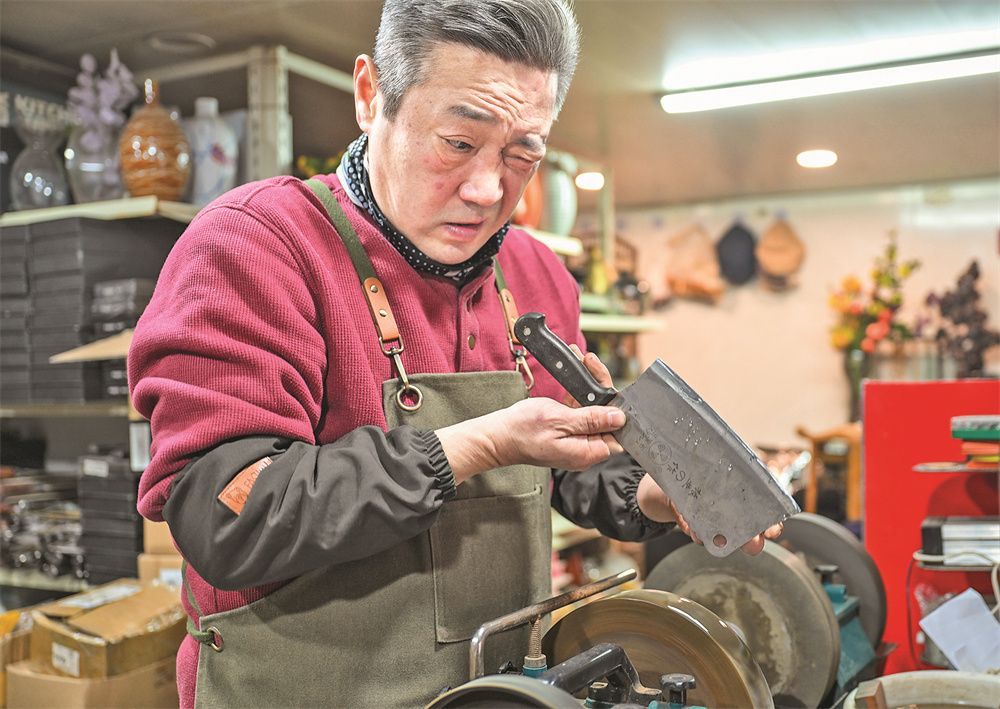 12月9日,商戶在查看打磨的菜刀。